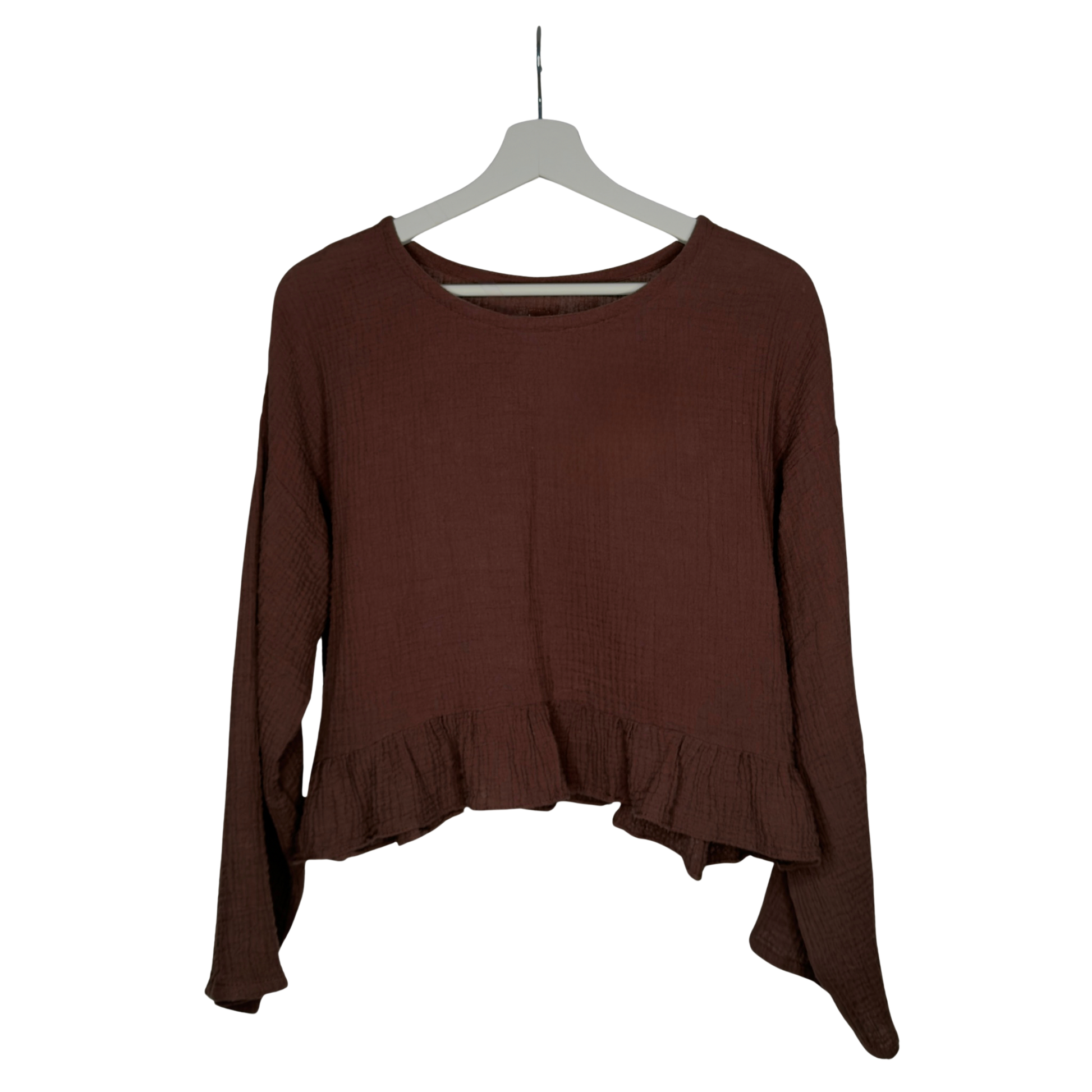 Der lockere Schnitt bietet Bewegungsfreiheit, während der zarte Rüschenabschluss am unteren Rand der Bluse einen femininen Touch verleiht. So entsteht ein Look, der schlicht, aber trotzdem besonders ist.